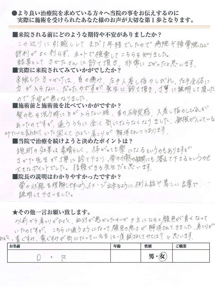 施術の効果は素晴らしく、体がとても楽になるというのもありますが、さかた先生が丁寧に診てくださり、骨の状態の疑問にも答えて下さるというのも大きなポイントでした。信頼できる先生だと思います。