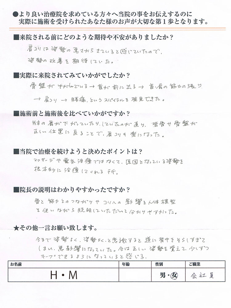 ずっと首や肩に問題があると思っていましたが、実際は骨盤の歪みが原因ということが治療を通して分かりました。長年悩んでいた他の症状も改善されてきたので続けようと思いました。