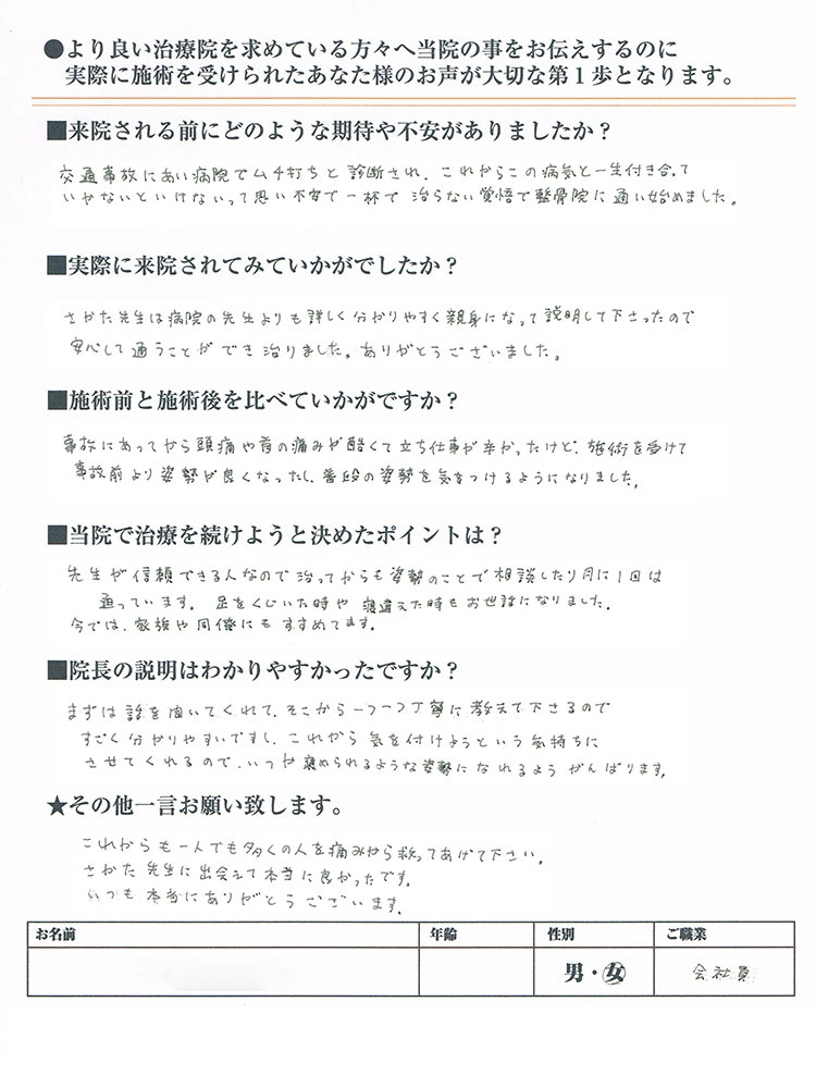 先生が信頼できる人なので、治ってからも姿勢のことで相談したり月に1回は通っています。足をくじいた時や寝違えた時もお世話になりました。今では家族や同僚にもすすめています。