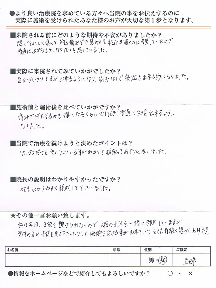 腰がとにかく痛くて朝方痛みで目覚めたり、靴下が履くのに苦労していたので普通に出来るようになりたいと思っていました。