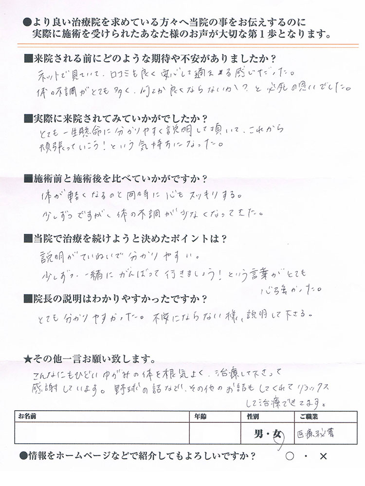 こんなにもひどいゆがみの体を根気よく治療して下さって感謝しています。野球の話などその他のお話もしてくれてリラックスして治療できてます。
