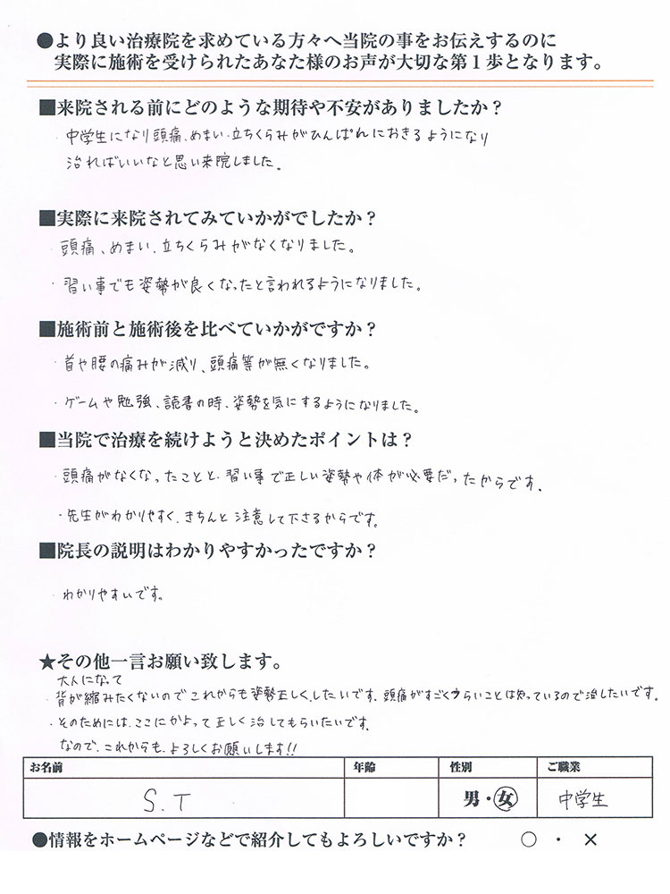 中学生になり頭痛、めまい、立ちくらみがひんぱんにおきるようになり、治ればいいなと思い来院しました。