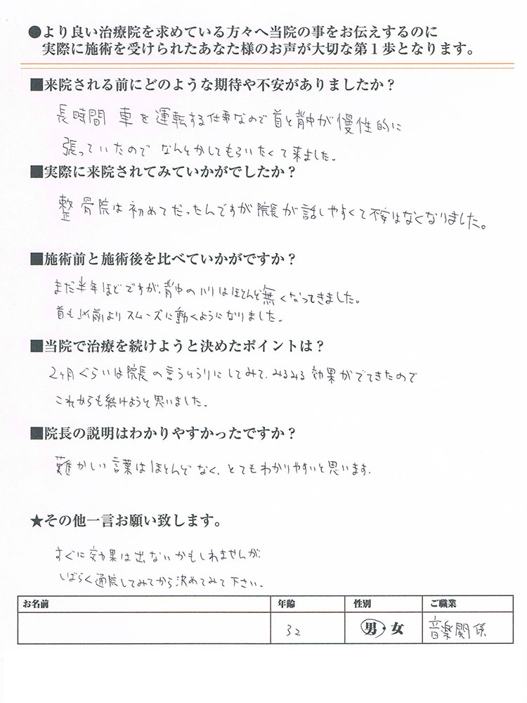 長時間車を運転する仕事なので、首と背中が慢性的に張っていたのでなんとかしてもらいたくて来ました。