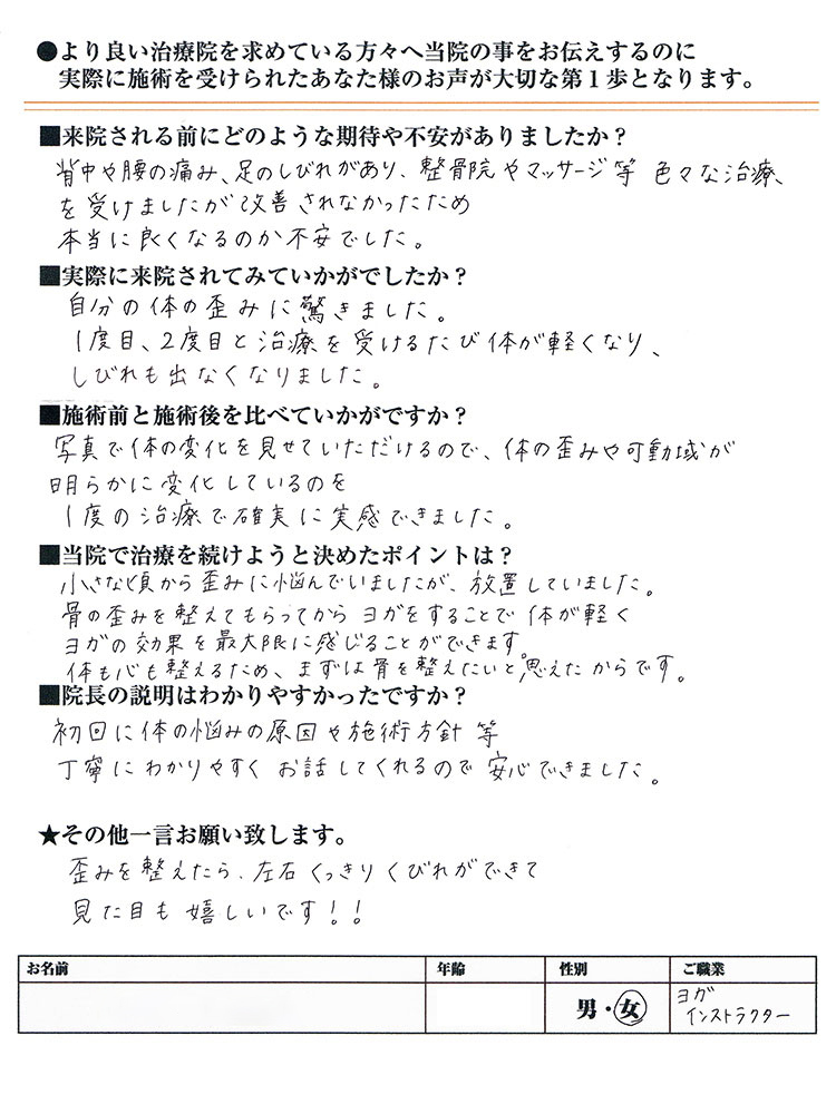 小さな頃から歪みに悩んでいましたが、放置していました。骨の歪みを整えてもらってからヨガをすることで体が軽く、ヨガの効果を最大限に感じることができます。体も心も整えるため、まずは骨を整えたいと思えたからです。