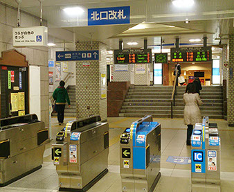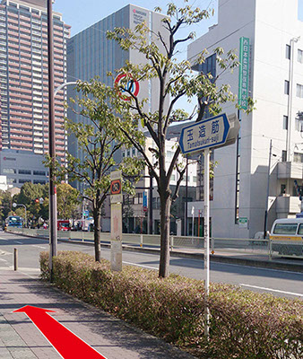 ■改札を出て北へ進むと長堀通にでます。交差点の信号を北へ渡ります。